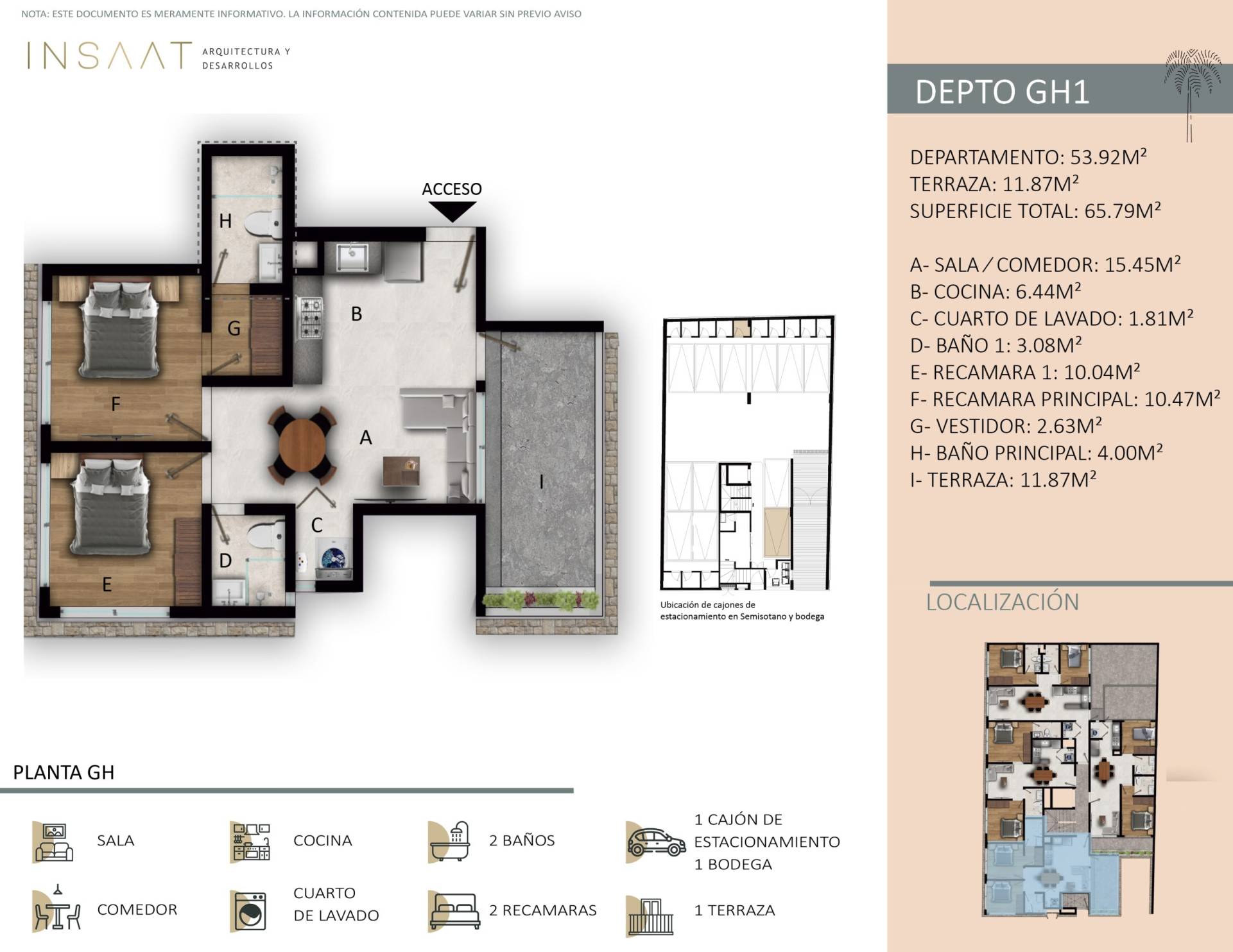 Depto. GH1 superficie 65.79m², 1 balcón, bodega, 1 cajón de estacionamiento $4,600,000.00